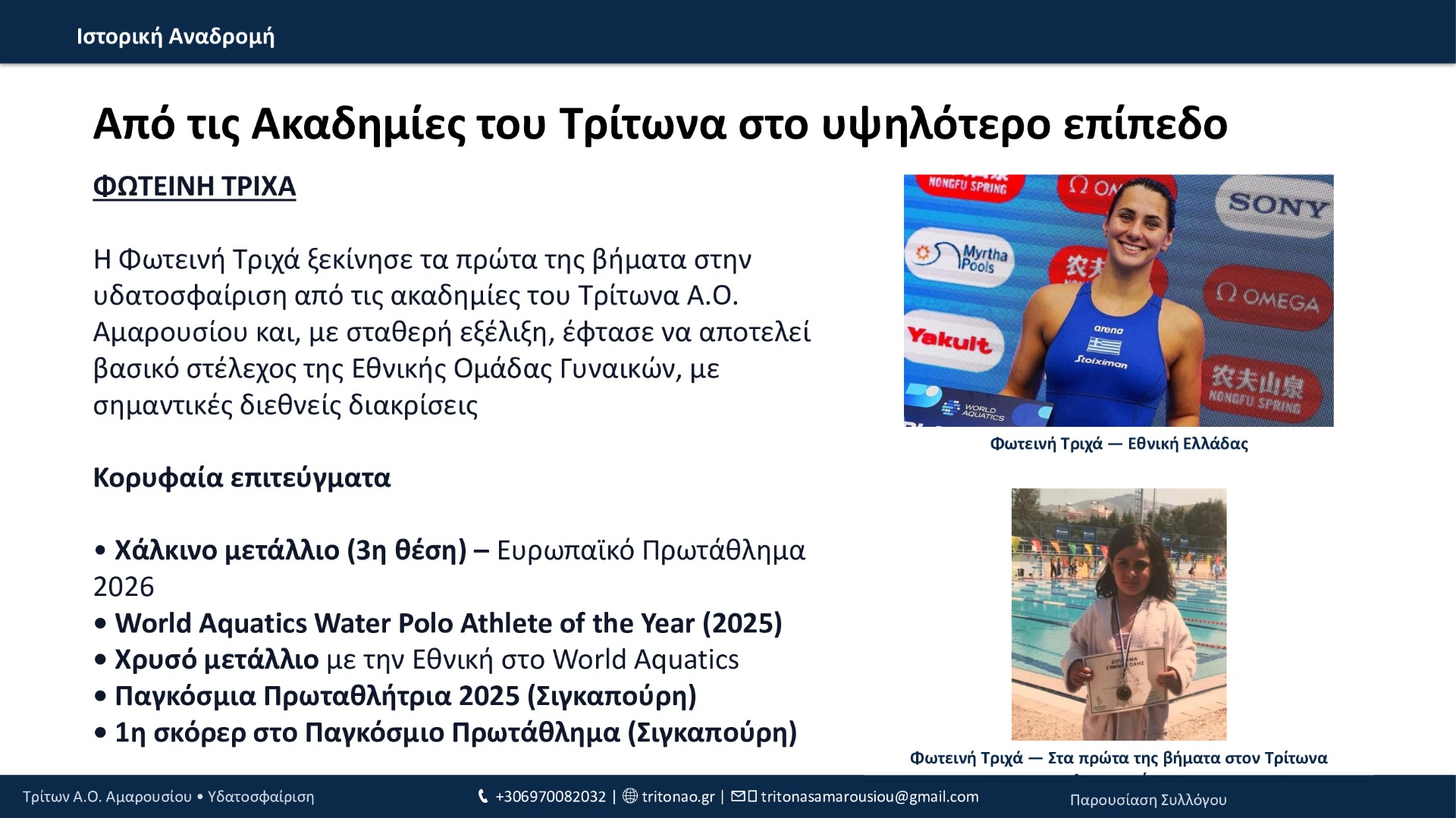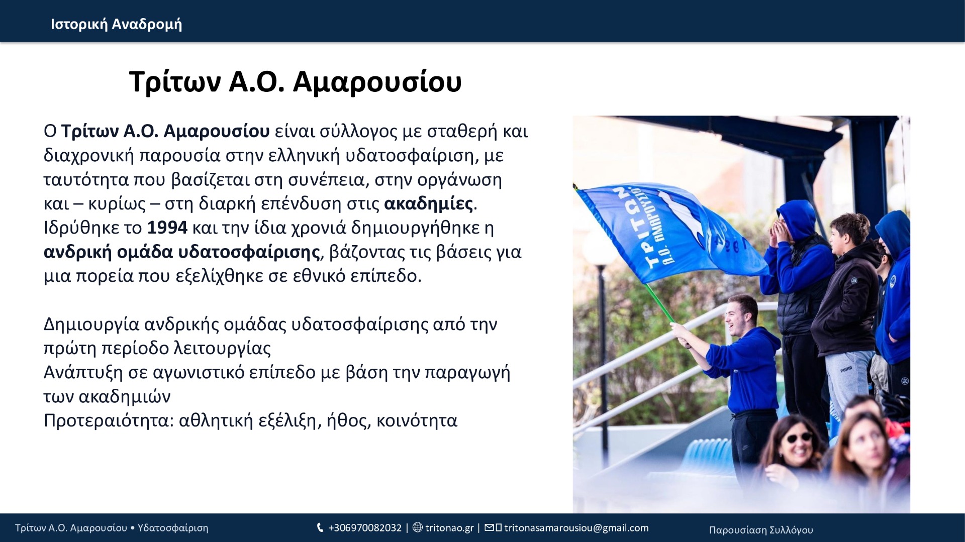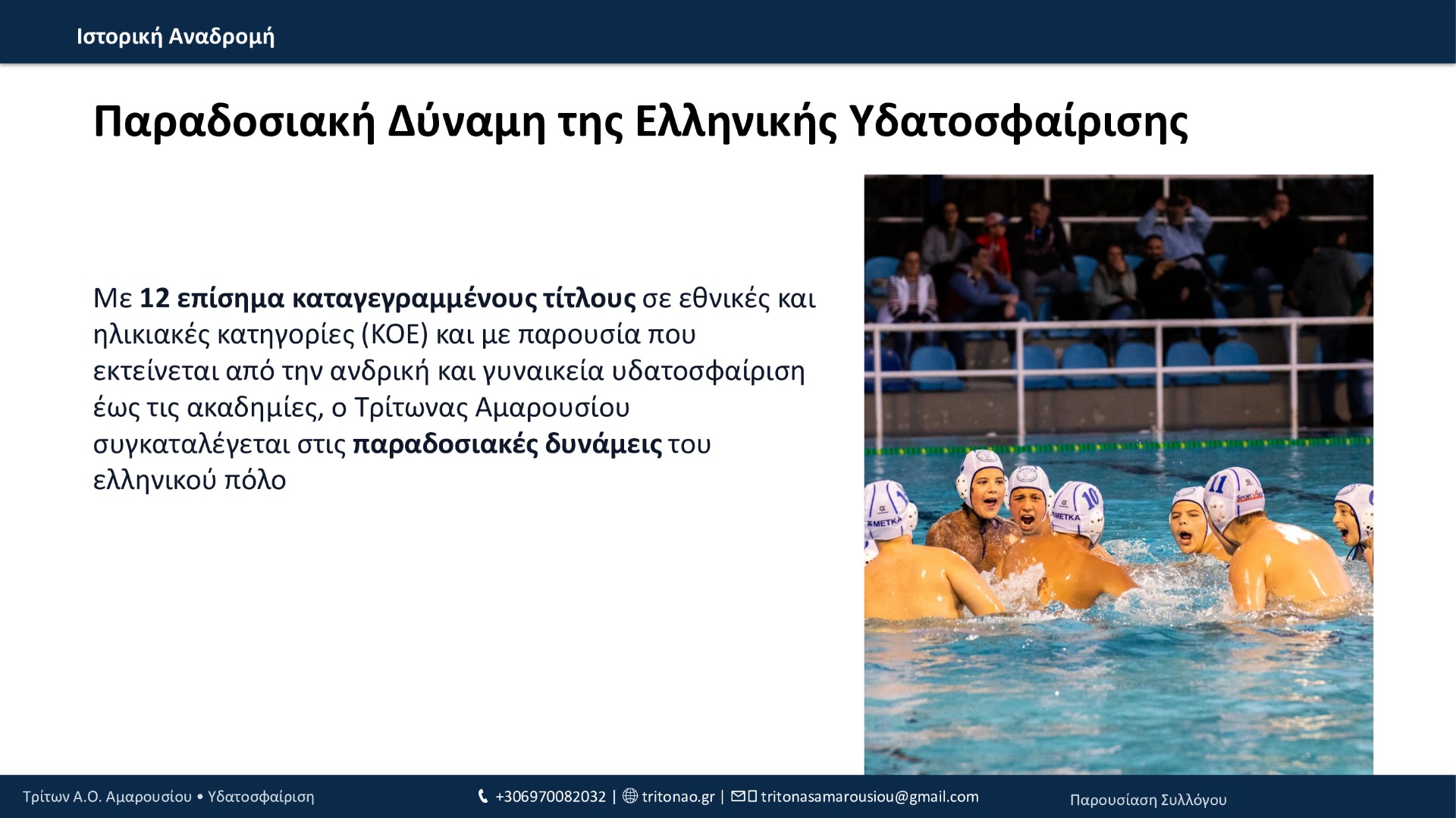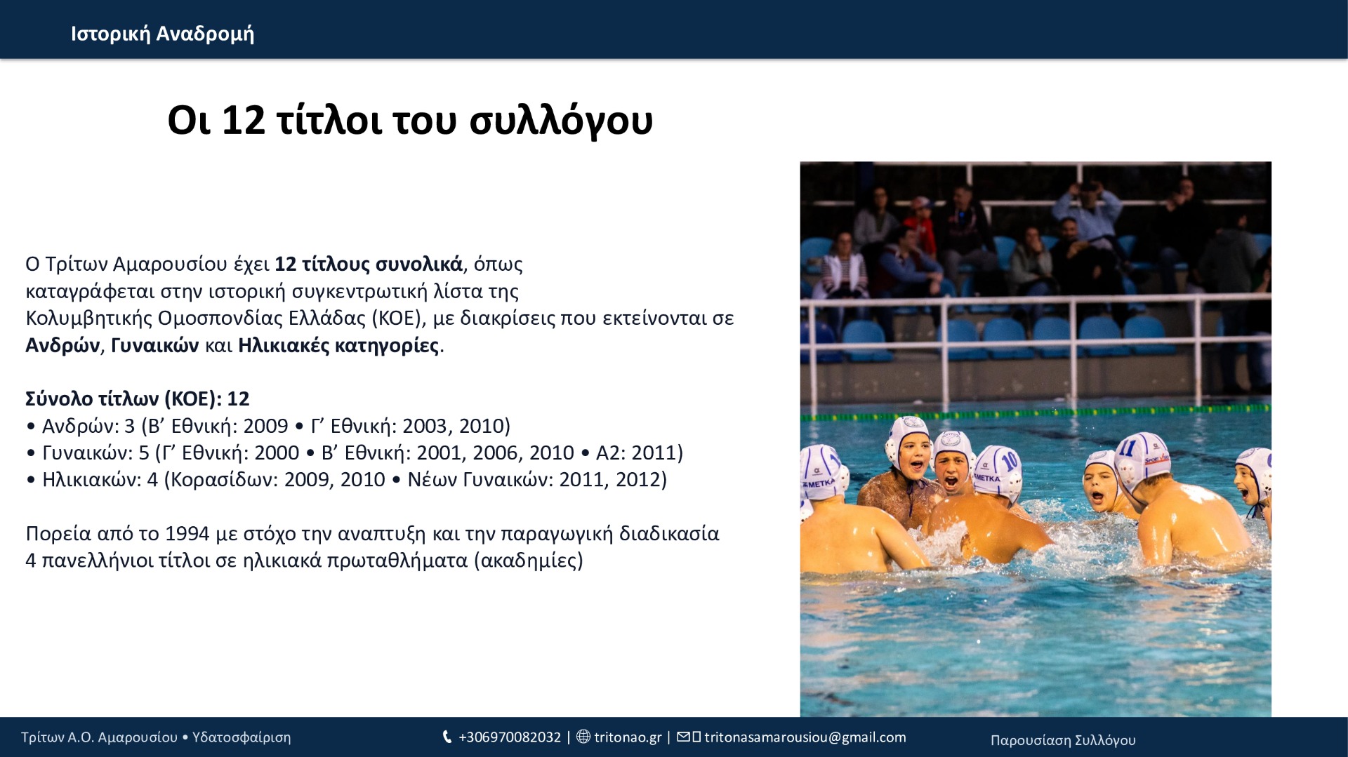 Από το 1994 μέχρι σήμερα, ο Τρίτων Α.Ο. Αμαρουσίου έχει χτίσει μια πορεία με συνέπεια και φιλοδοξία: 12 τίτλοι συνολικά, σημαντικές επιτυχίες στις ηλικιακές κατηγορίες, επένδυση στις ακαδημίες και, πλέον, σταθερή παρουσία στην Εθνική Κατηγορία εδώ και 3 χρόνια. Με οδηγό τις αξίες του συλλόγου και τη δύναμη της κοινότητάς του, ο Τρίτων συνεχίζει να εξελίσσεται και να υπηρετεί την υδατοσφαίριση με προοπτική.