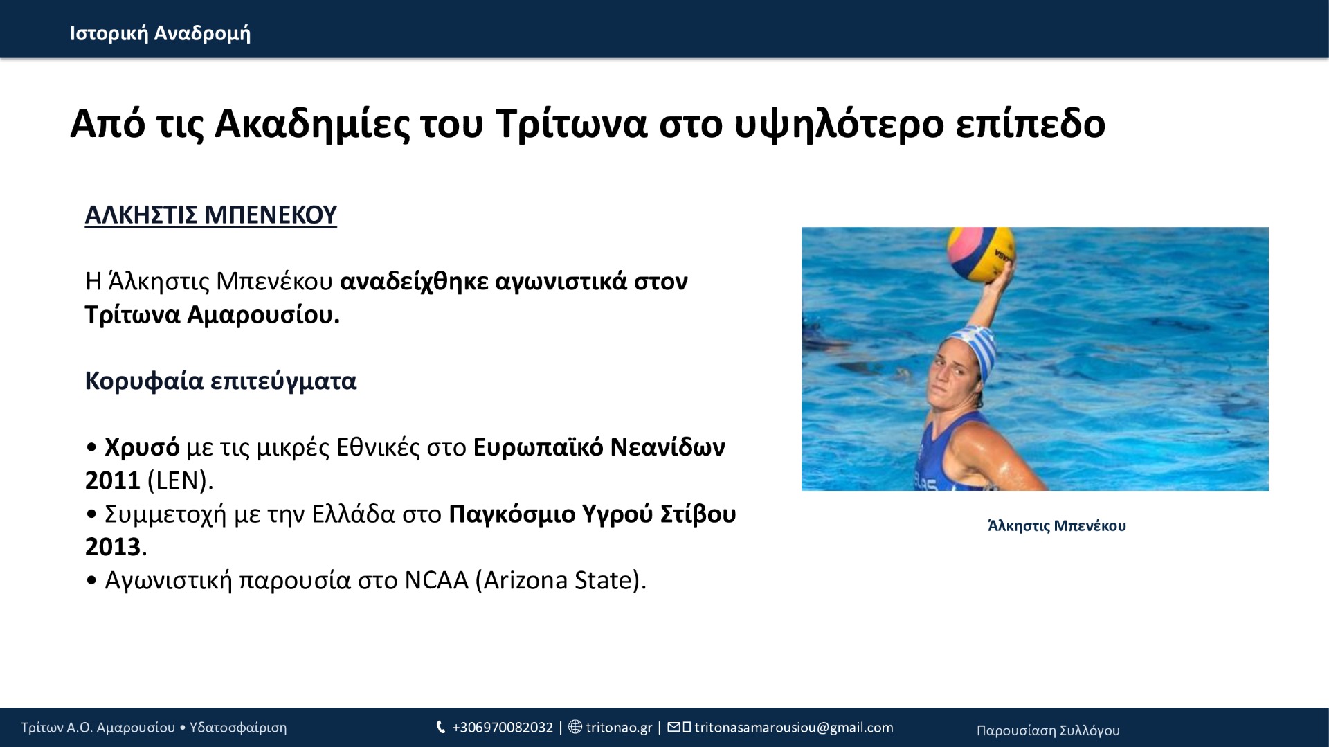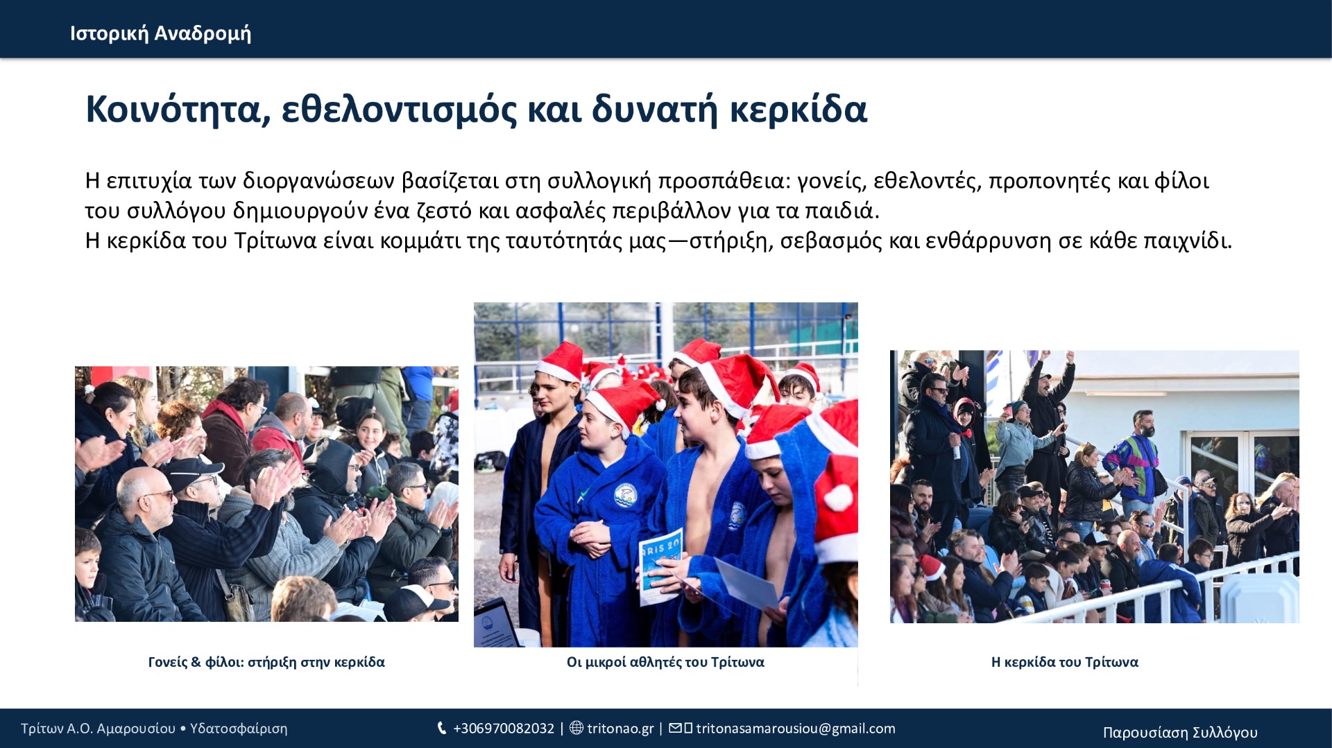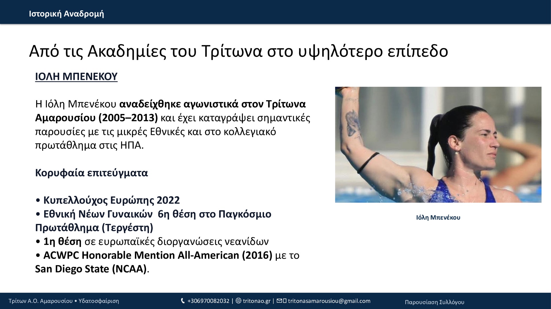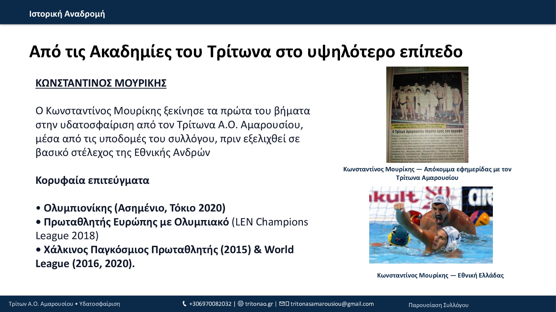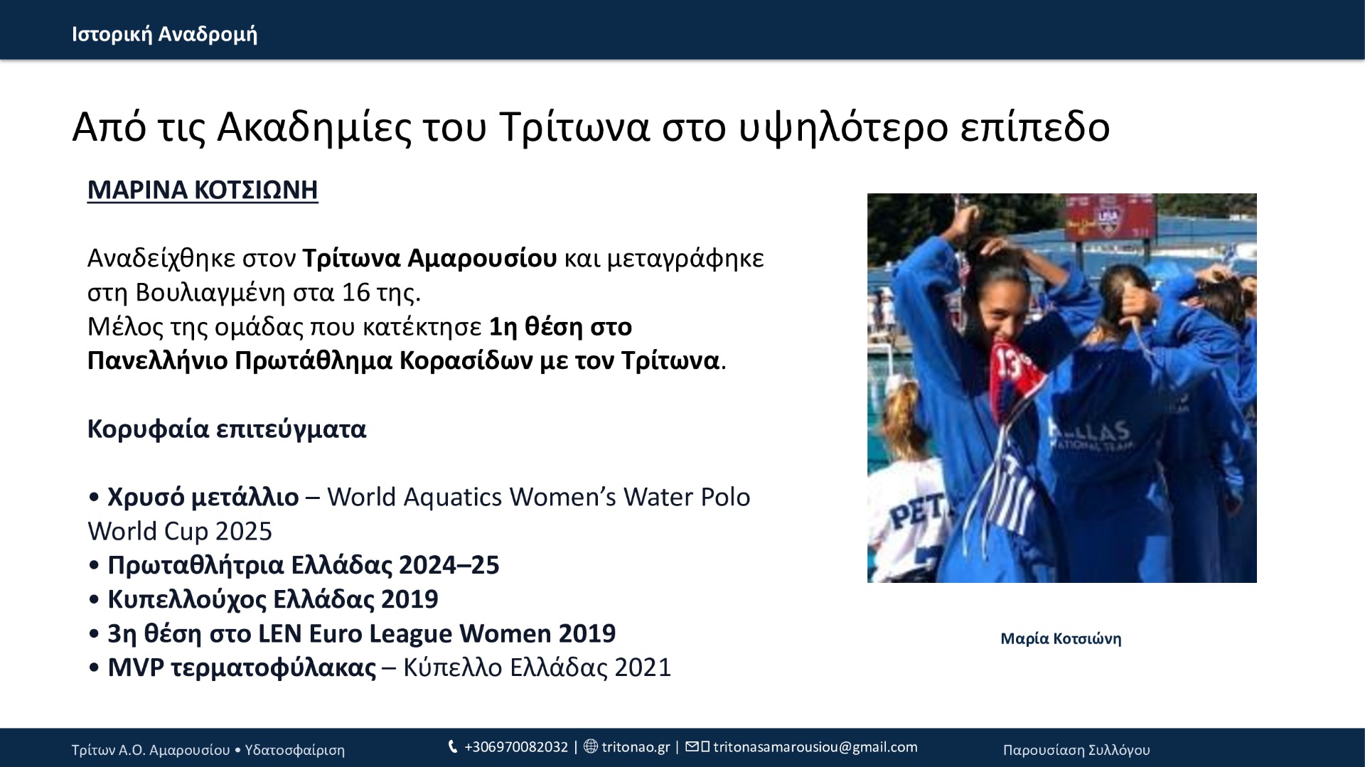 Από το 1994 μέχρι σήμερα, ο Τρίτων Α.Ο. Αμαρουσίου έχει χτίσει μια πορεία με συνέπεια και φιλοδοξία: 12 τίτλοι συνολικά, σημαντικές επιτυχίες στις ηλικιακές κατηγορίες, επένδυση στις ακαδημίες και, πλέον, σταθερή παρουσία στην Εθνική Κατηγορία εδώ και 3 χρόνια. Με οδηγό τις αξίες του συλλόγου και τη δύναμη της κοινότητάς του, ο Τρίτων συνεχίζει να εξελίσσεται και να υπηρετεί την υδατοσφαίριση με προοπτική.