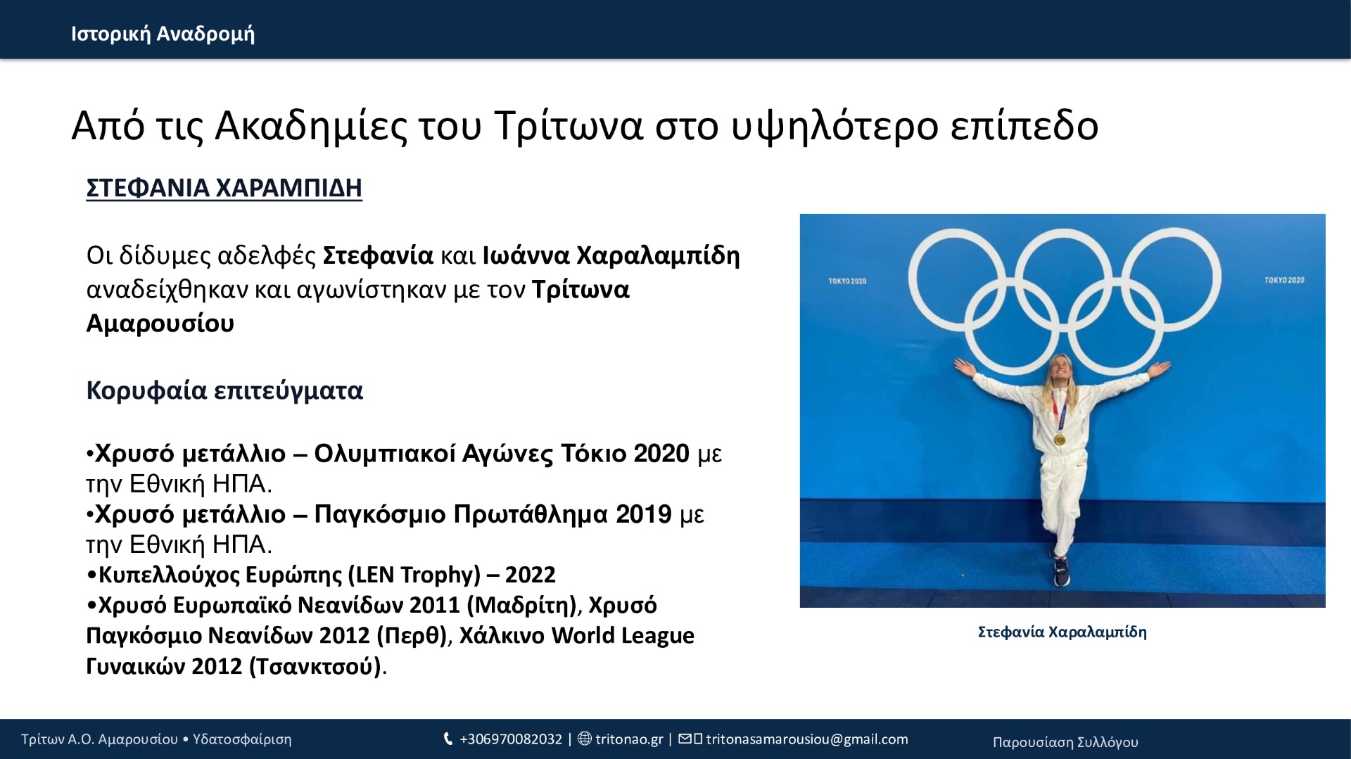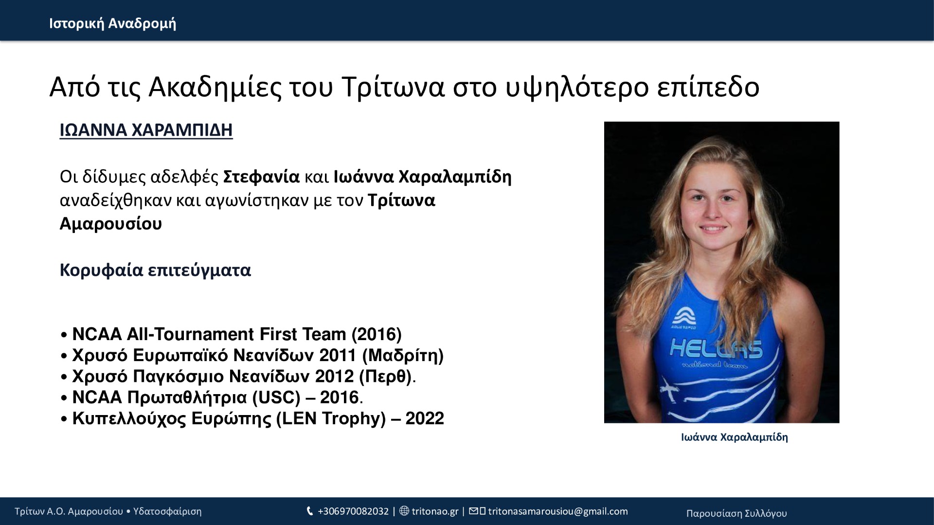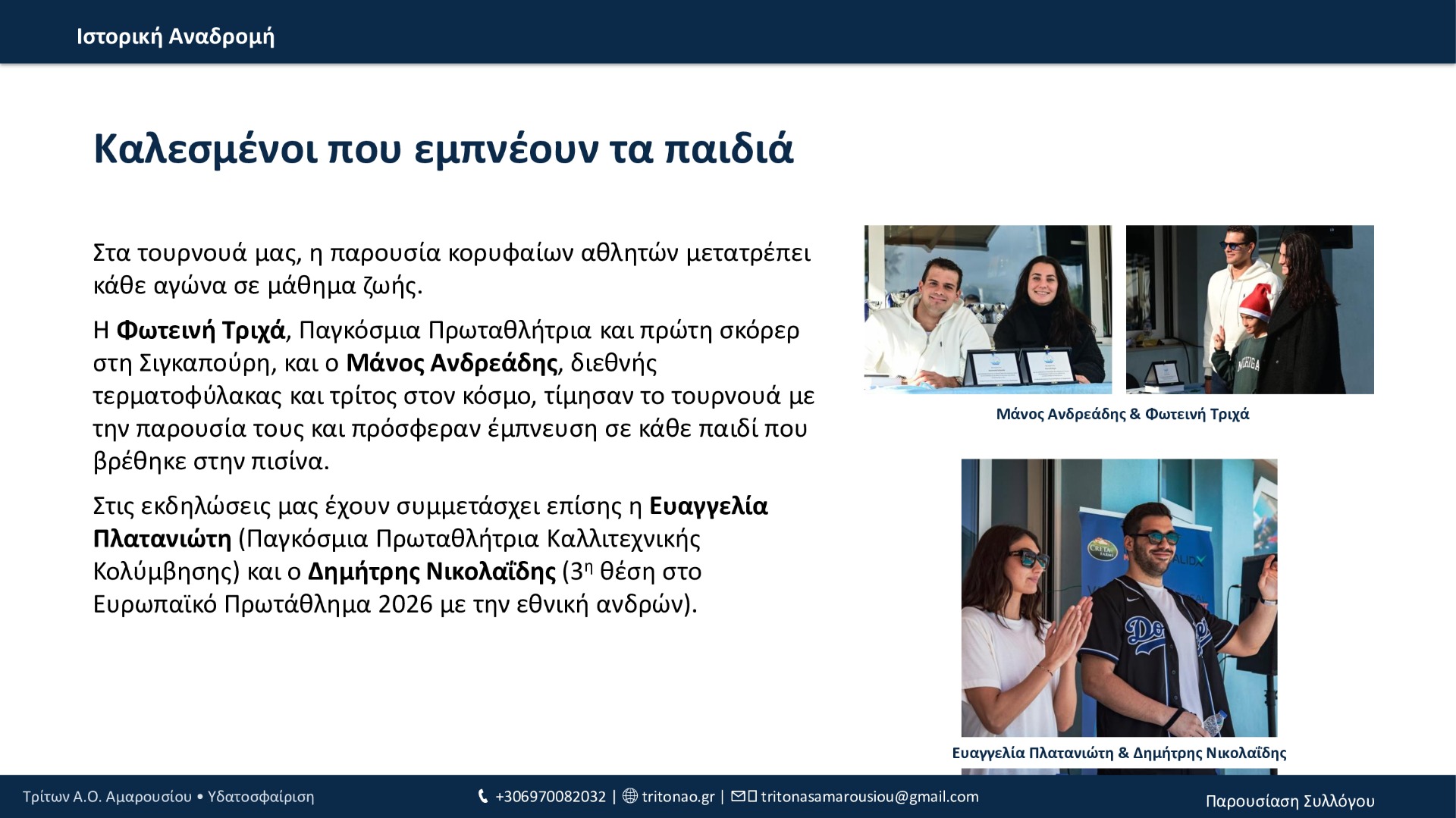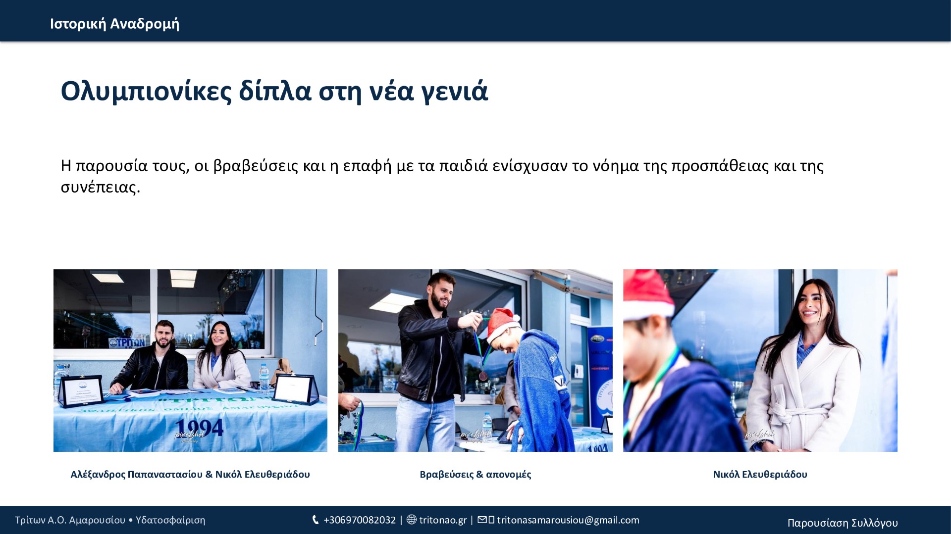 Από το 1994 μέχρι σήμερα, ο Τρίτων Α.Ο. Αμαρουσίου έχει χτίσει μια πορεία με συνέπεια και φιλοδοξία: 12 τίτλοι συνολικά, σημαντικές επιτυχίες στις ηλικιακές κατηγορίες, επένδυση στις ακαδημίες και, πλέον, σταθερή παρουσία στην Εθνική Κατηγορία εδώ και 3 χρόνια. Με οδηγό τις αξίες του συλλόγου και τη δύναμη της κοινότητάς του, ο Τρίτων συνεχίζει να εξελίσσεται και να υπηρετεί την υδατοσφαίριση με προοπτική.