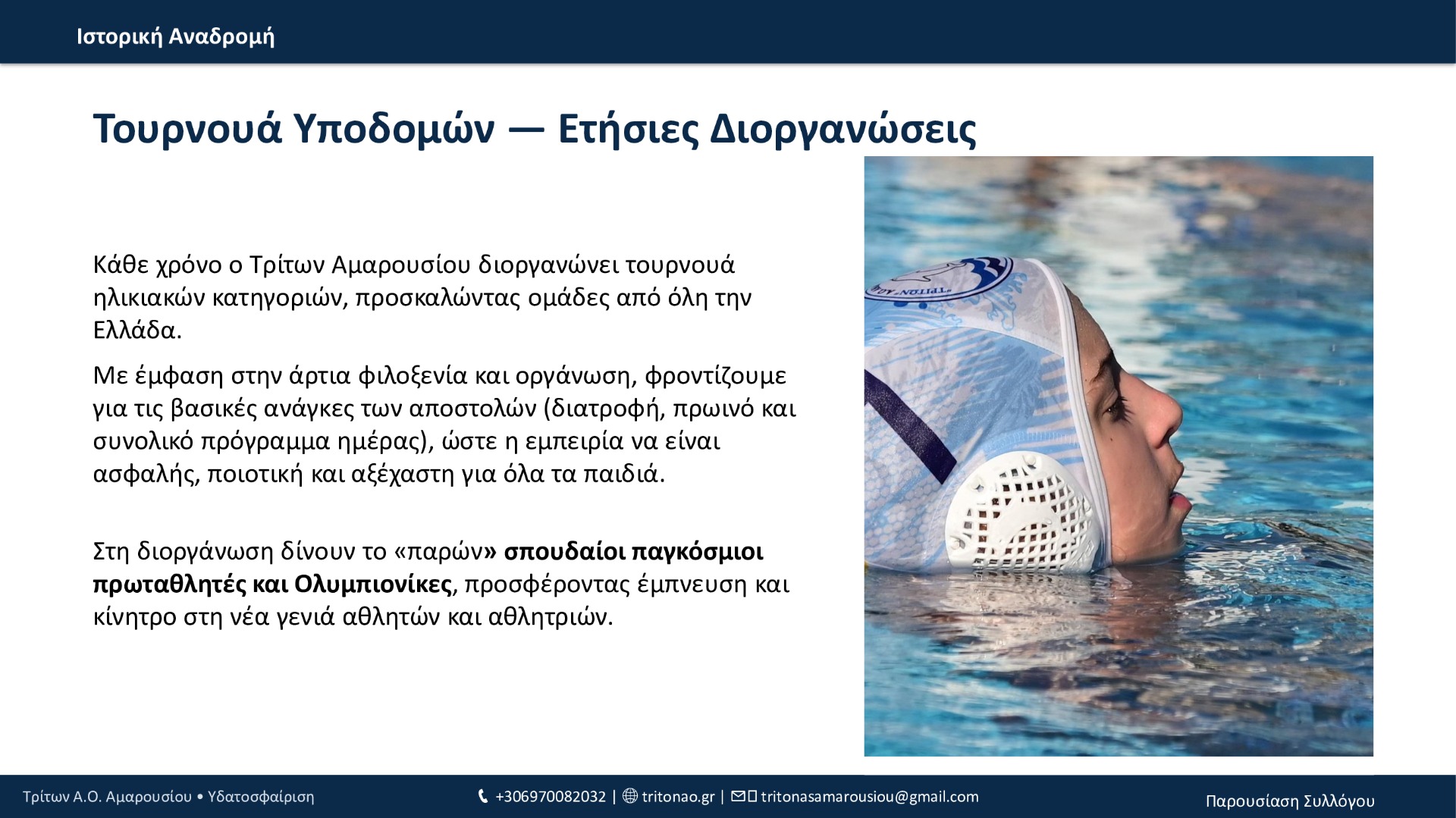 Ο Τρίτων Α.Ο. Αμαρουσίου αποτελεί έναν σύλλογο με μακρά και διακριτή παρουσία στην υδατοσφαίριση, χτίζοντας την ταυτότητά του πάνω στη συνέπεια, την οργάνωση και – κυρίως – στην παραγωγή αθλητών μέσα από τις ακαδημίες. Από την ίδρυσή του, ο σύλλογος λειτουργεί ως αθλητική «οικογένεια» για το Μαρούσι και την ευρύτερη περιοχή, με σταθερή στόχευση στην καλλιέργεια αξιών όπως η ομαδικότητα, η πειθαρχία, η εξέλιξη και η ευγενής άμιλλα.